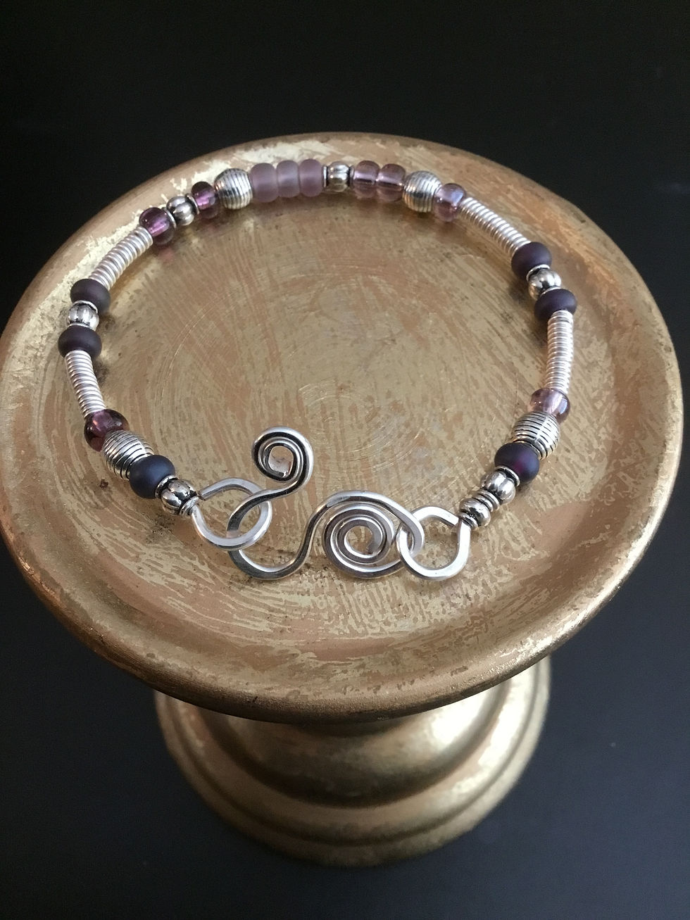 Looking for a unique and elegant addition to your wardrobe, look no further than our handcrafted bracelets. Made with 14 gauge wire and featuring a turned, hammered clasp, each piece is adorned with beautiful Matabo Beads and coiled wire to create a stunning final design. Shop our collection and add a touch of sophistication to your style!